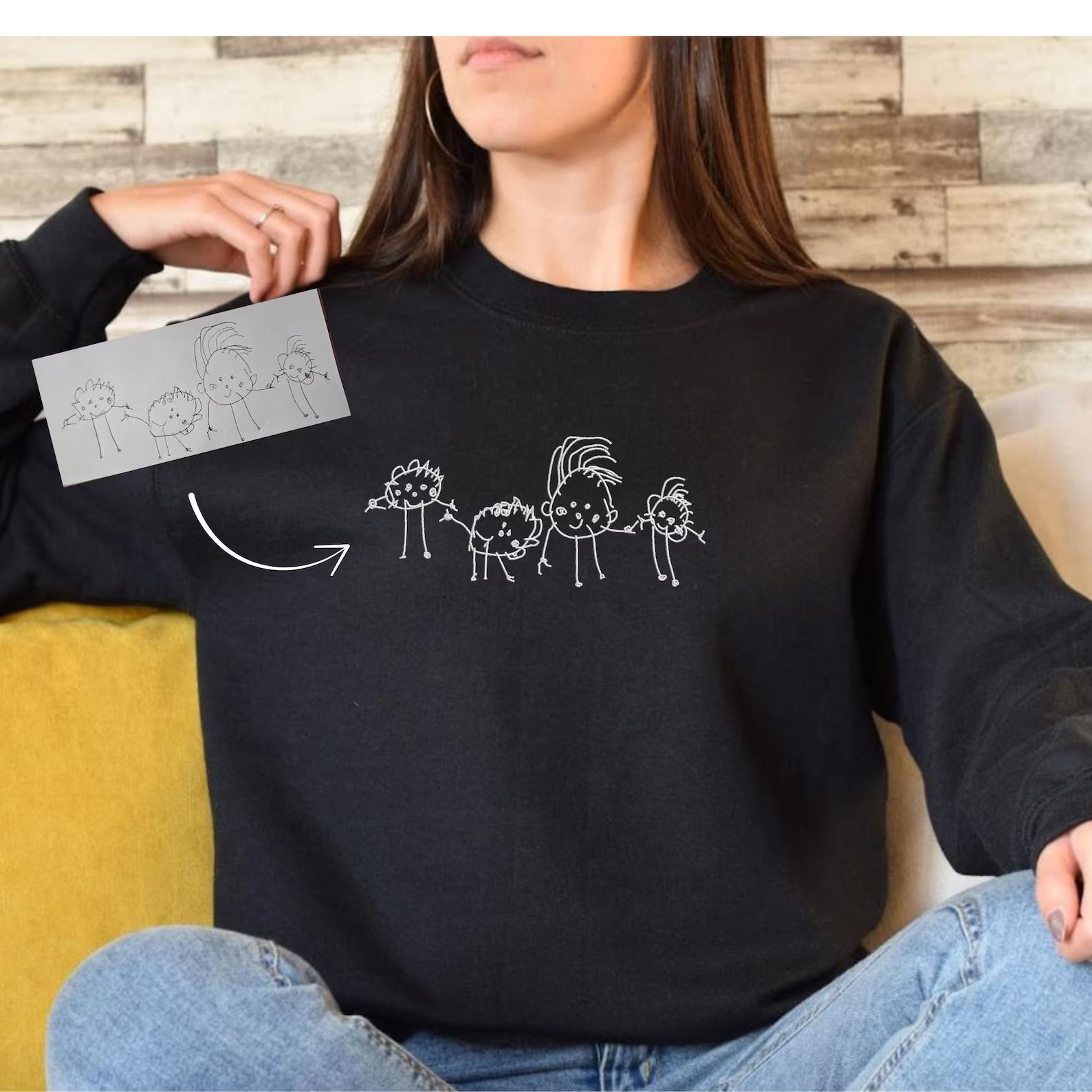 Kitul complet de amintiri pentru mamici: Pulover Adult + Tote Bag, ambele brodate cu desenul copilului. Cel mai stylish mod de a purta arta lui. Economiseste 39 RON.